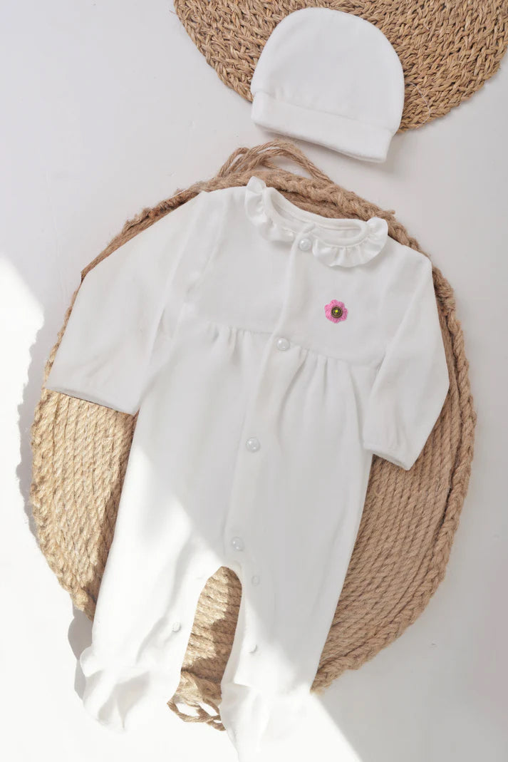 A cute long sleeves romper detailed with a crochet flower snaps covered with pearl buttons...