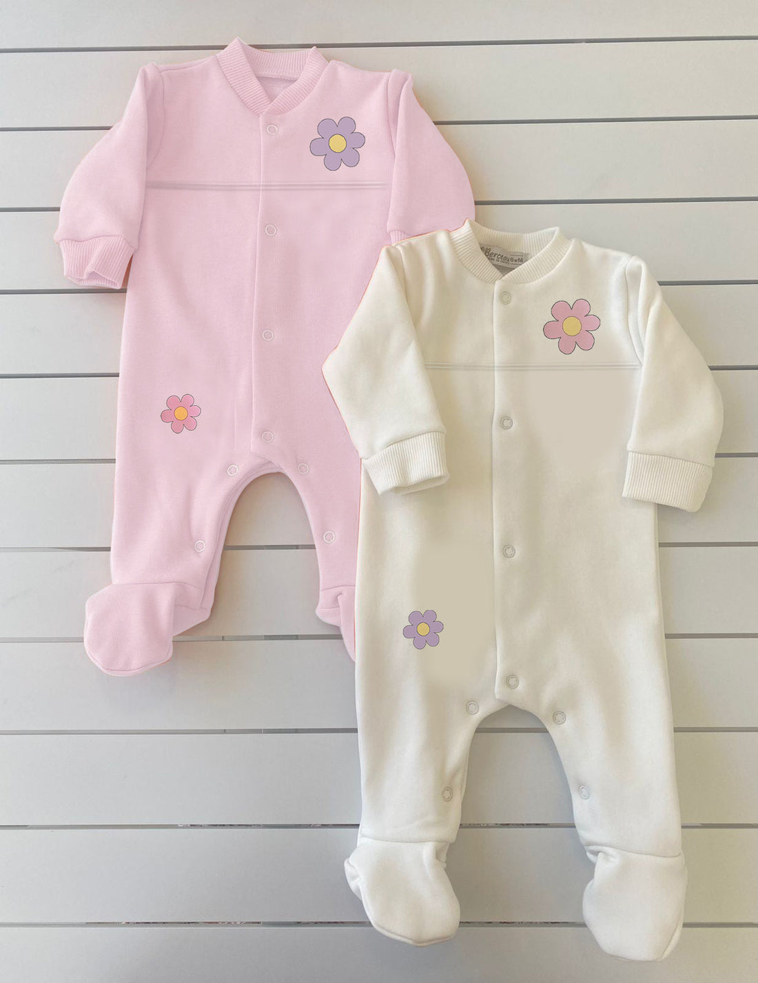 Soft pink fleece romper for infants Long sleeves and enclosed feet for full-body warmth Adorable...