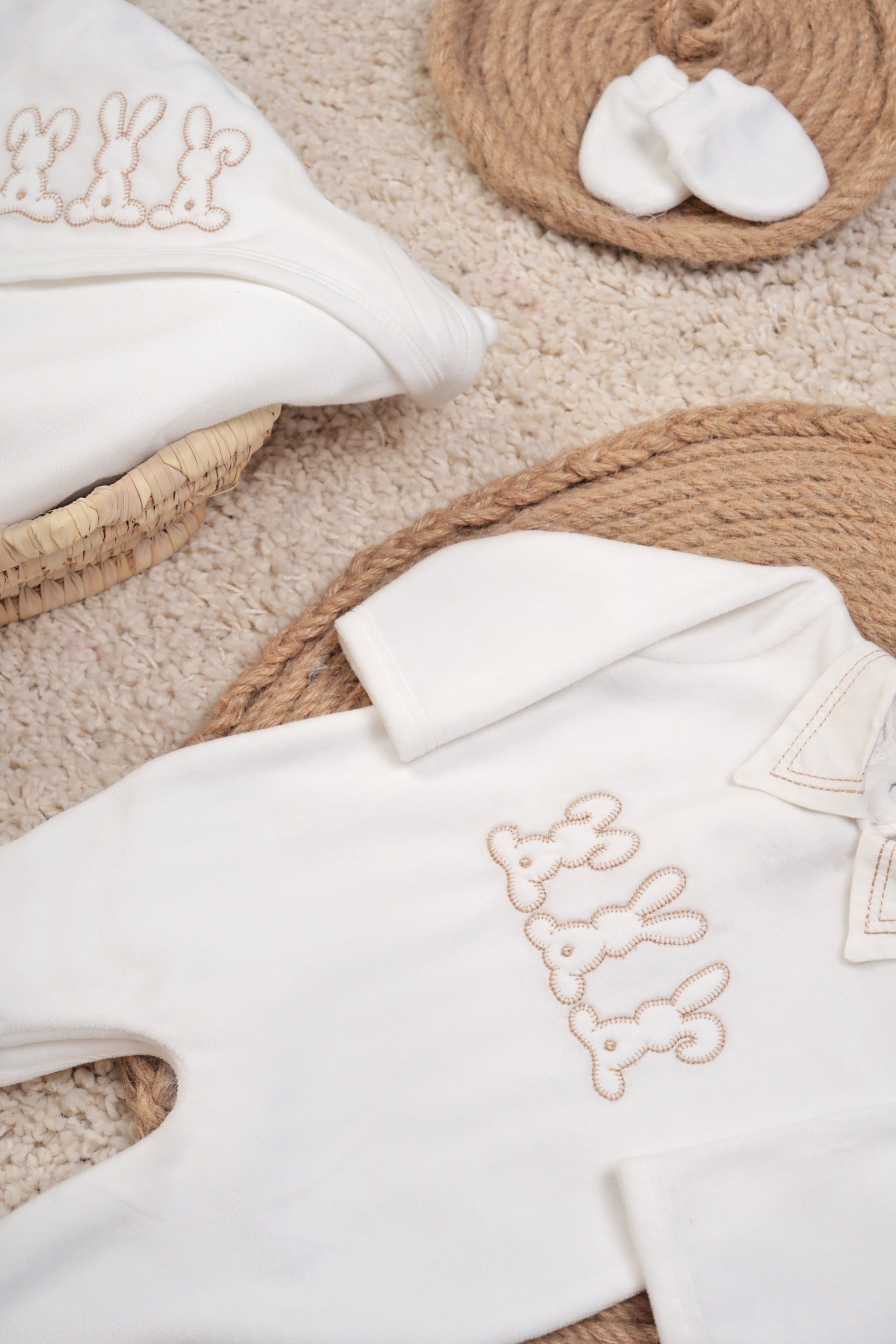- Cozy velvet onesie with embroidered bunny design