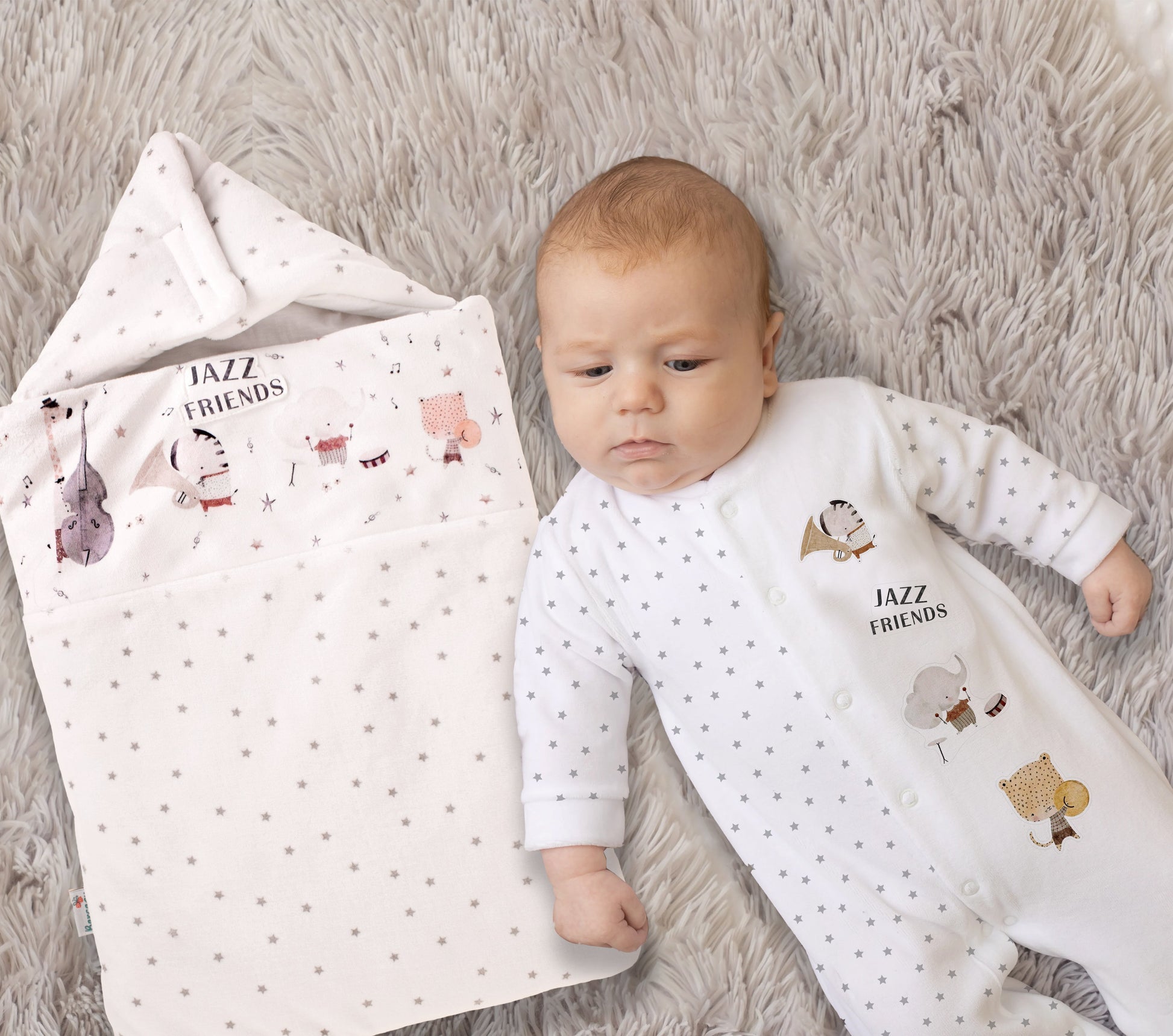 Both items feature our whimsical 'Jazz Friends' motif with charming musical animals. The soft, high-quality materials will keep your baby snug during chilly days. Ideal for newborns and infants, this set makes a perfect gift or addition to your baby's winter wardrobe.