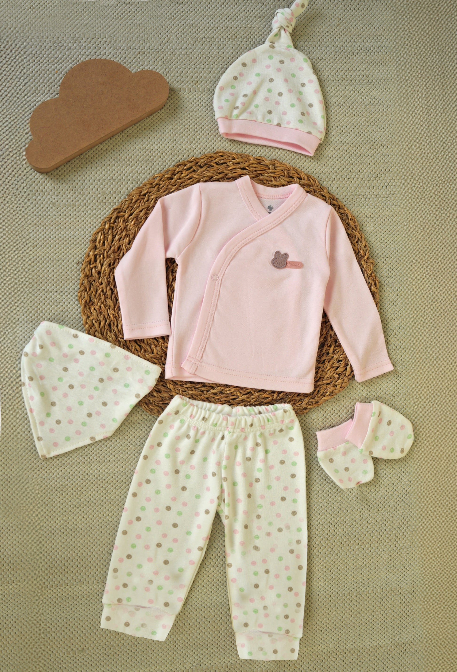 Wrap your little one in comfort with this charming 5-piece cotton set. The collection features a soft pink kimono-style top with a sweet bunny detail, paired with polka-dotted pants in a gentle cream base adorned with pink, green, and brown dots. The matching accessories include a coordinating knotted cap, cozy mittens , and an adorable bandana bib—all in the same playful polka dot pattern.