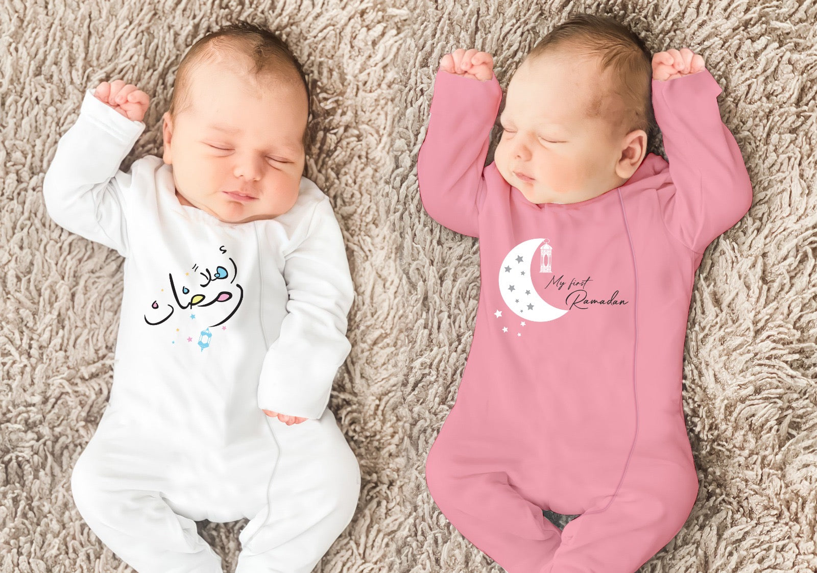 "Celebrate your little one's First Ramadan in style with our special twin-pack of baby sleepsuits. This adorable set features two cozy zip-up onesies made from soft, breathable cotton - perfect for keeping your baby comfortable day and night.